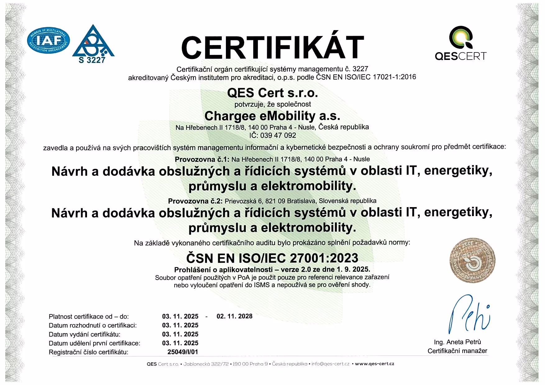 S ISO/IEC 27001 získáváte partnera, který umí chránit vaše data o uživatelích, dobíjení i provozu infrastruktury. Nastavené procesy řízení přístupů, práce s incidenty a kontinuity provozu pomáhají splnit vaše interní i regulatorní požadavky. Jste tak lépe připraveni na NIS2 a další bezpečnostní standardy, aniž byste museli řešit bezpečnost dobíjení „in-house“.