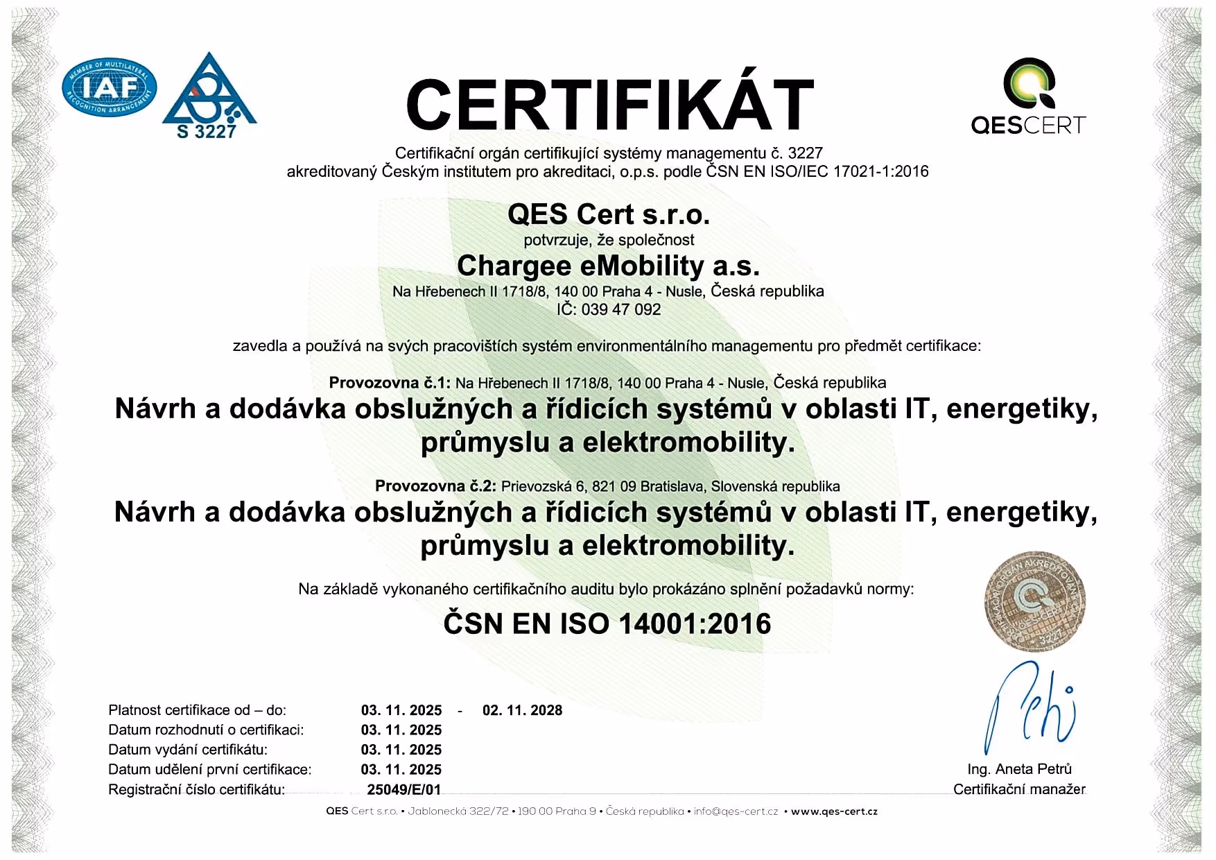 ISO 14001 zajišťuje, že při návrhu a provozu dobíjecího řešení myslíme i na dopady na životní prostředí. Díky systematickému řízení energií, odpadů a servisní dopravy pomáháme snižovat uhlíkovou stopu vašich projektů. Podporujeme tím vaše ESG cíle a usnadňujeme splnění požadavků investorů, zákazníků i regulace.
